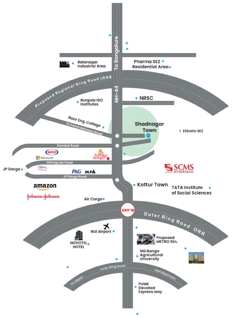 Located in the fast-developing corridor of Shadnagar beside NH 44 (Bengaluru Highway), Fortune Avenue offers excellent connectivity to major industries, IT hubs, educational institutions, and the airport — making it a prime destination for both investment and future living.